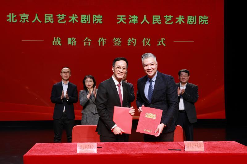 现场,北京人艺院长冯远征与天津人艺院长李阳分别代表双方签署协议,天津北方演艺集团董事长杨红杰、总经理辛江,北京人艺副院长秦新春,以及刚刚上任的北京人艺副院长唐烨在现场共同见证。